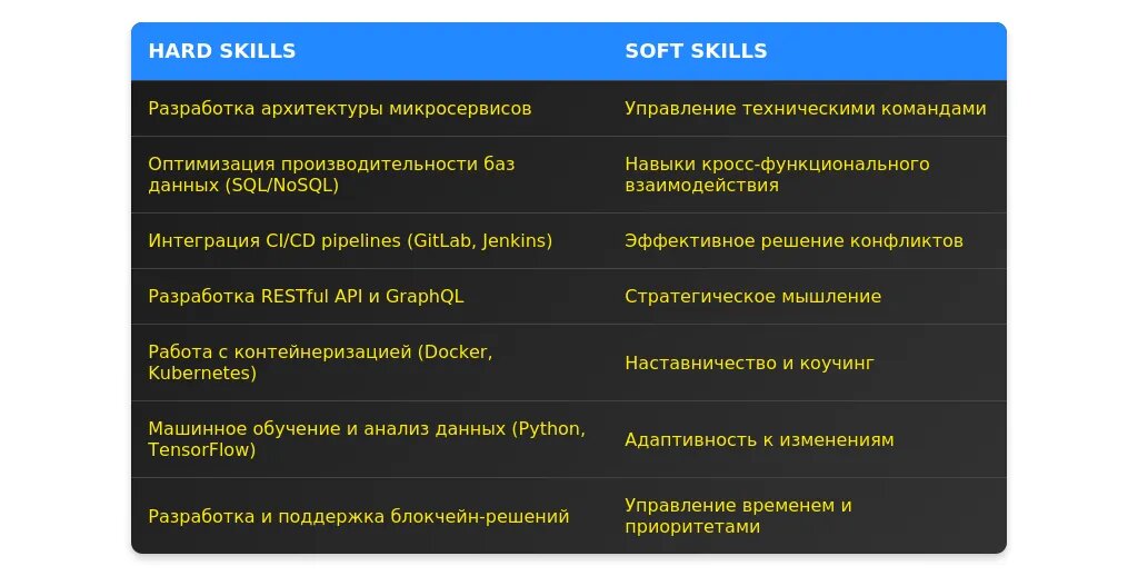 Согласно анализу вакансий на hh.ru, работодатели выделяют следующие hard skills как ключевые для ведущих специалистов-программистов: