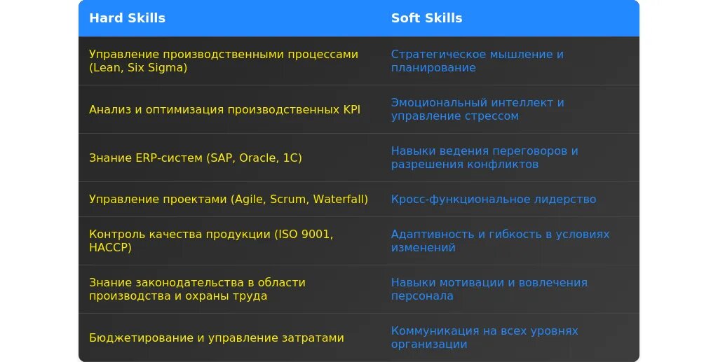 На что делать акцент: навыки управления, аналитические способности, знание технологий производства.