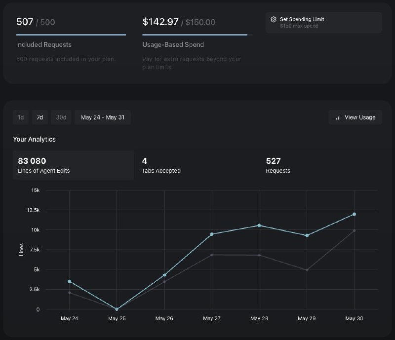 курсор обновил личный кабинет, не то чтобы вау, но получше чем было) жаль светлой темы не завезли еще... А как у вас со статистикой использования за последние 7 дней - кидайте в комменты, сравним (ради интереса любопытствую)