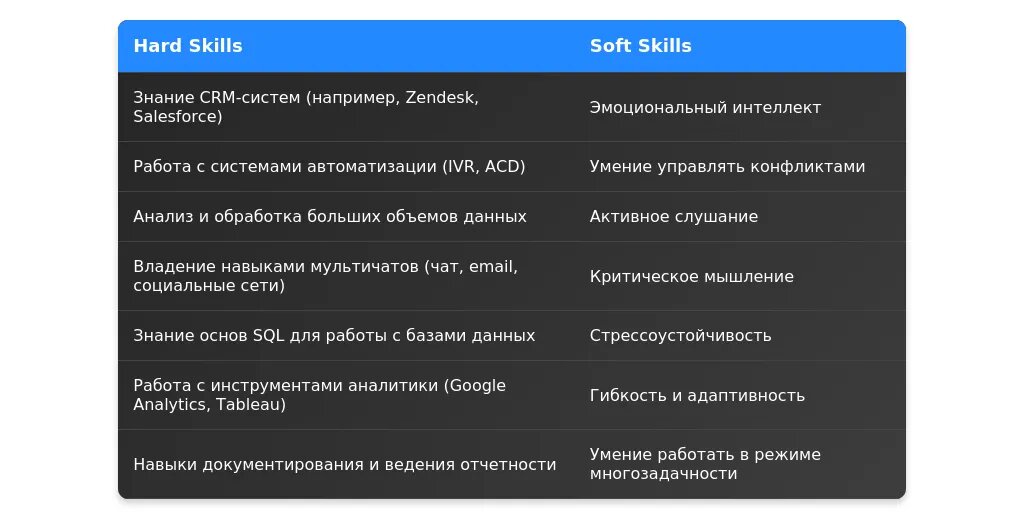После адаптации: "Работа с CRM-системами, обработка возражений, работа в многозадачном режиме, знание английского языка."
