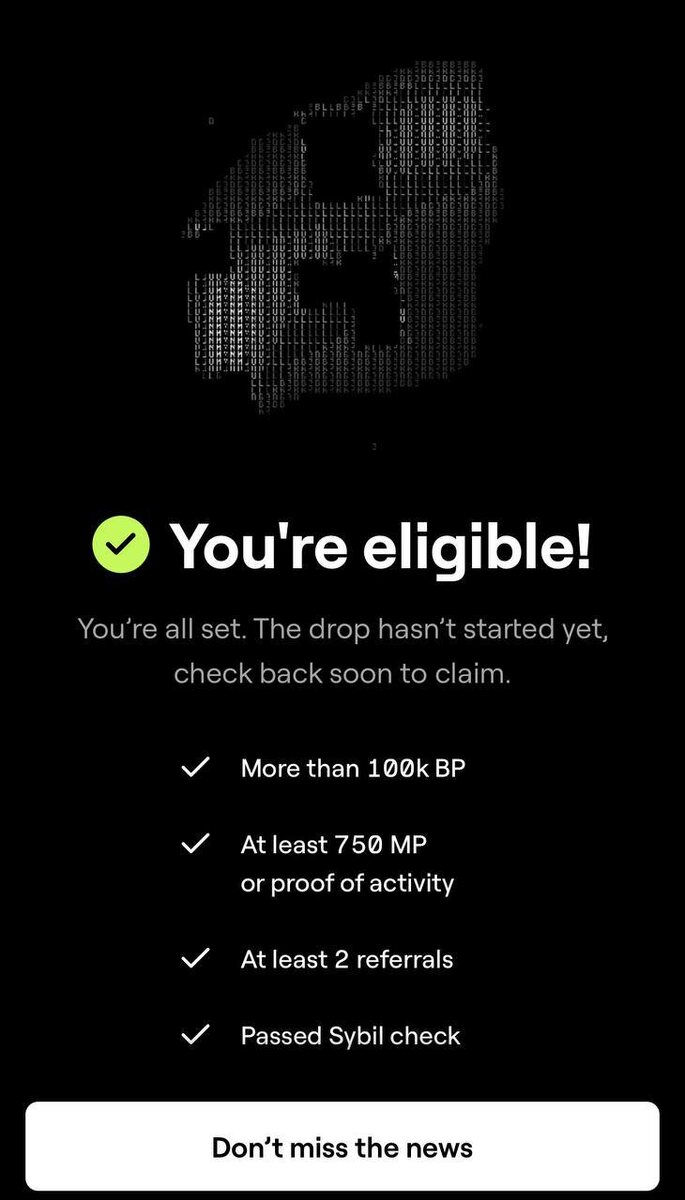 📜 Blum выкатили чекер дропа. Уже сейчас мы можем проверить, проходим ли мы по критериям для получения дропа в Blum. ✔️ 📋 Критерии для получения дропа: 1️⃣100K+ BP 2️⃣750+ MP 3️⃣ 2 реферала Снепшот запланирован на начало июня.
