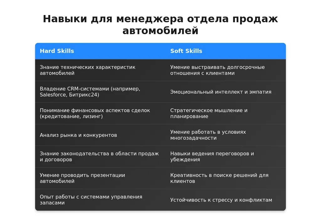 После адаптации: "Навыки ведения переговоров, работа с CRM-системами, знание автомобильного рынка."