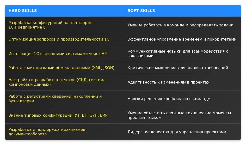 При анализе вакансии для программиста-разработчика 1C важно обращать внимание на ключевые требования, которые делятся на обязательные и желательные. Обязательные требования — это те, без которых кандидат не сможет выполнять задачи (например, знание платформы 1С:Предприятие 8.3, опыт разработки конфигураций). Желательные требования — это навыки, которые повышают конкурентоспособность кандидата (например, знание SQL, опыт интеграции 1С с другими системами).