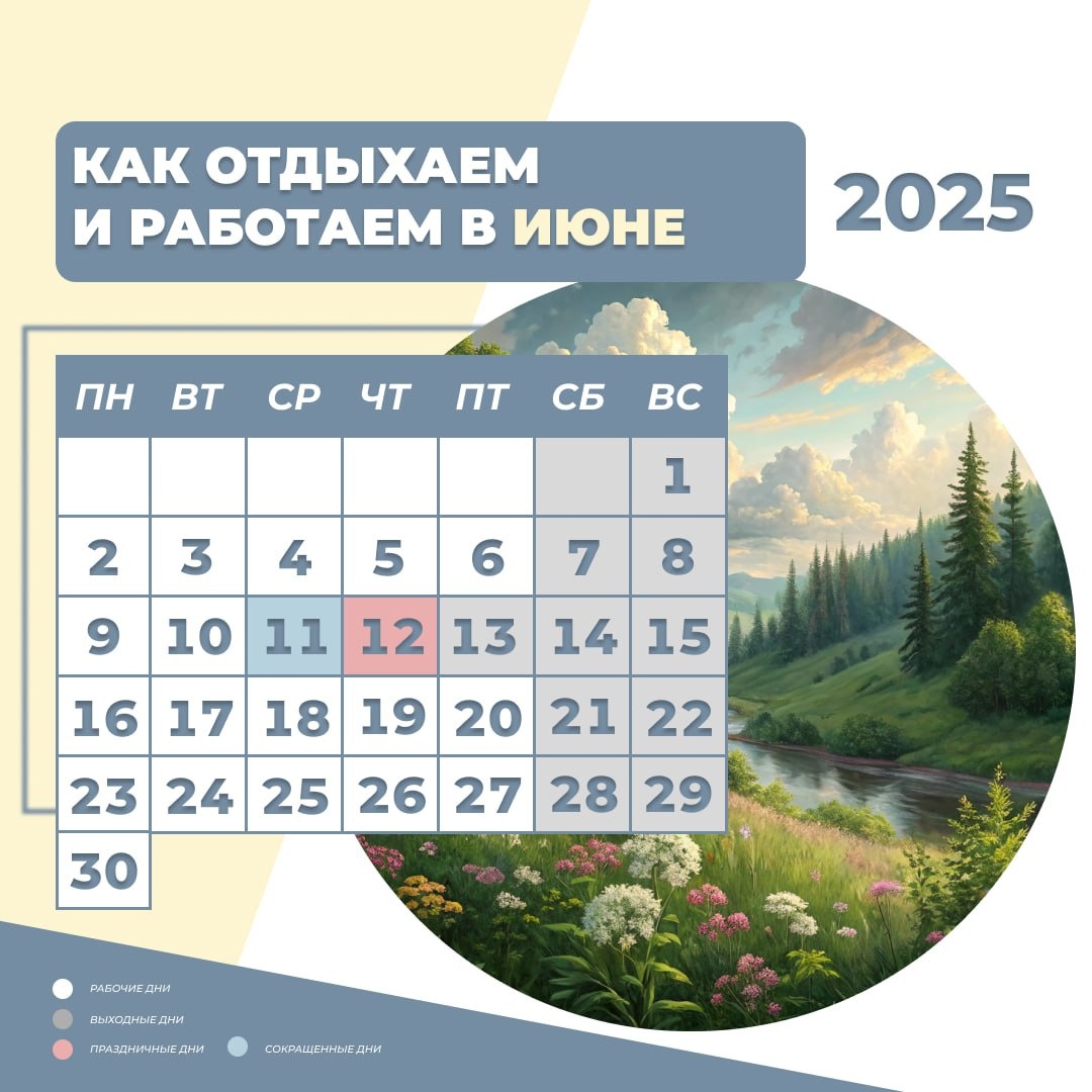 🌸 С наступлением июня нас ждут летние деньки и долгожданные выходные — идеальное время для отдыха, встреч с близкими и новых впечатлений. 📆 В июне 2025 года — 19 рабочих дней и 11 выходных. Единственный государственный праздник этого месяца — День России (12 июня). 🌟 11 июня — сокращенный предпраздничный день (на 1 час меньше). 🌟 13 июня — дополнительный выходной за счет переноса на этот день субботы 8 марта. ✨ Заранее планируйте июнь, чтобы провести месяц с пользой и радостью! #сахалинскаяобласть #сахалин #календарьсобытий