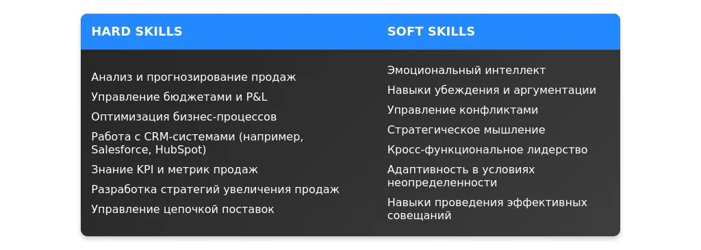 - Технические навыки (Hard Skills): управление продажами, аналитика, CRM-системы.