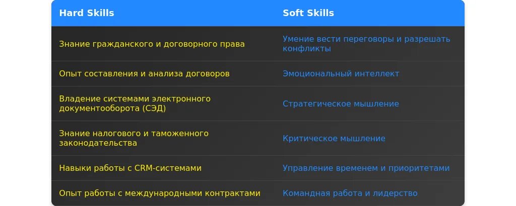 - Аналитическое мышление: успешно выявлял риски в договорах, что позволило избежать убытков.
