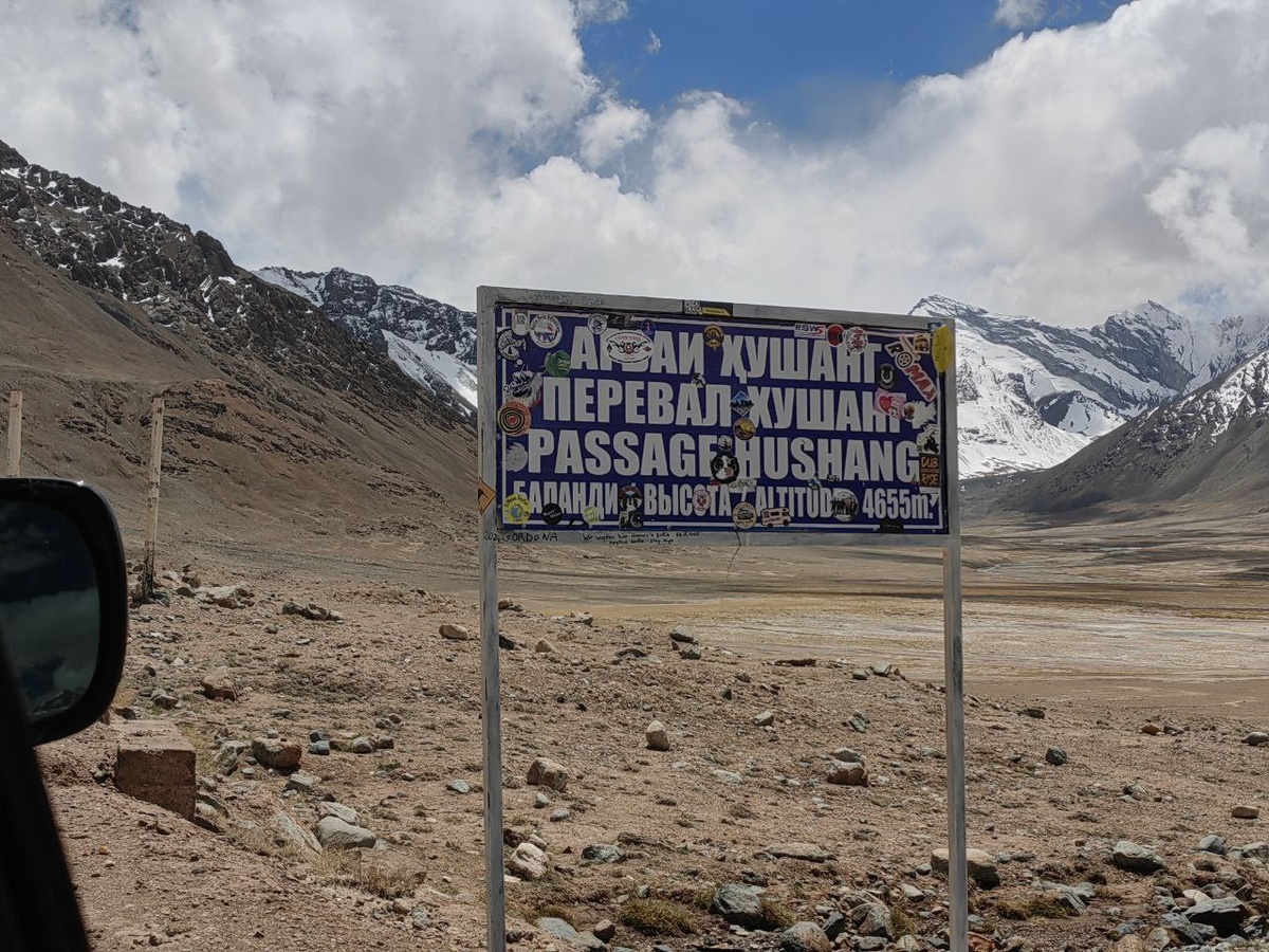 Перевал Хушанг, он же Акбайтал. Самая высокая точка Памирского тракта и самый высокий автомобильный перевал на постсоветском пространстве - 4655 метров. Несмотря на то, что перевал самый-самый, он мне показался гораздо легче предыдущего Кызыл-Арт (4285) : серпантин хоть и есть, но не такой крутой, дорога - хорошая грунтовка и иногда даже асфальт есть (при спуске к Мургабу). Но горы на этом перевале сводят с ума постоянной сменой цветов - от коричневого к желтому и синему, плюс яркое небо и снежные вершины вокруг
