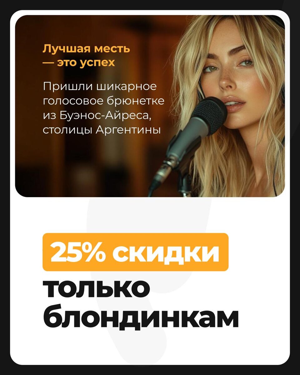 Кажется брюнетки забыли, кто тут главный! И сегодня лучший день взять реванш... Самая светлоголовая часть человечества 👩 отмечает свой праздник — День блондинок — в последний день весны — 31 мая. Мы точно знаем, что все истории о непрактичности блондинок — не больше, чем миф! Так что, блондинки, это ваш шанс утереть нос всем остальным с выгодой для себя. ‼️Только до конца дня мы дарим скидку 25% на любой курс по озвучке или подкастам школы TSSS. И ТОЛЬКО БЛОНДИНКАМ! 🔜 https://clck.ru/3MMPnV Шикарным блондинкам, восхитительным блондинкам, роковым блондинкам. Всем блондинкам, кто не раз слышал за спиной: «Она ж блондинка…» Хватит! Эту партию сыграете вы… И есть шанс, что на площади Plaza de Mayo в столице Аргентины, Буэнос-Айресе. Мальчики — опять мимо, уж простите. Обратитесь в профсоюз 🙃. А ко всем остальным у нас вопрос: «Как вы считаете, действительно ли джентльмены предпочитают блондинок?» * Администрация Школы оставляет за собой право запросить фотографию перед предостав