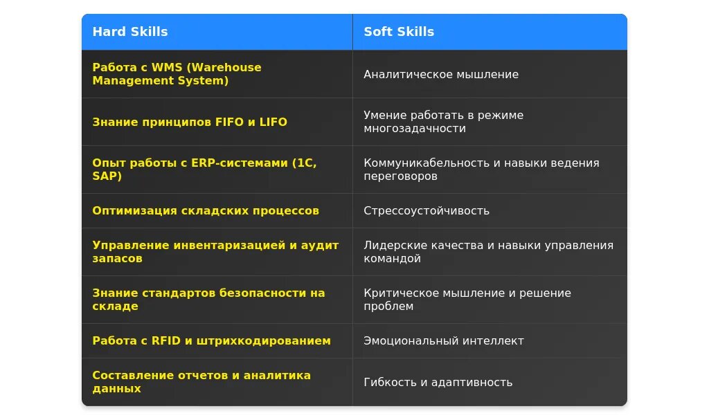 - Ключевые навыки, связанные с управлением складом, логистикой и учетом.
