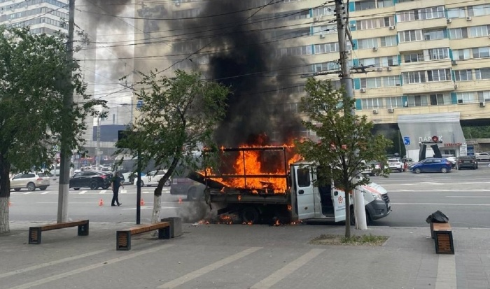 Опубликовано видео загоревшейся грузовой машины в центре Волгограда