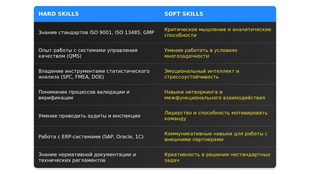 После адаптации: "Знание ISO 9001, опыт проведения внутренних аудитов, работа с CRM-системами."