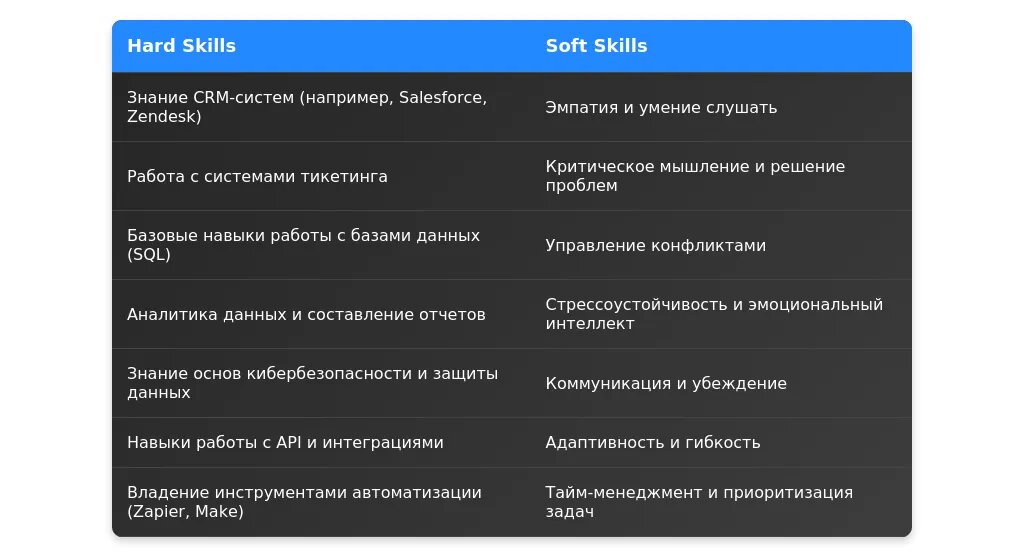 Навыки работы с CRM-системами (Salesforce, Zendesk), опыт решения конфликтных ситуаций, знание английского языка на уровне Upper-Intermediate.