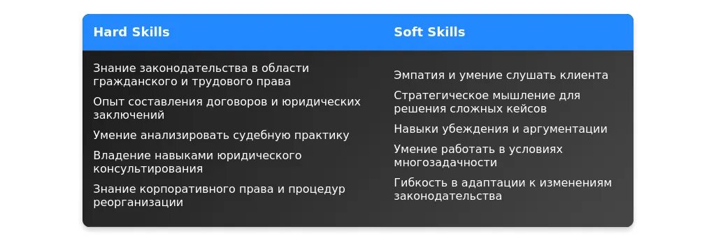 Навыки необходимо перегруппировать, чтобы выделить требуемые компетенции. Например, если вакансия требует знания корпоративного права, поставьте его на первое место.