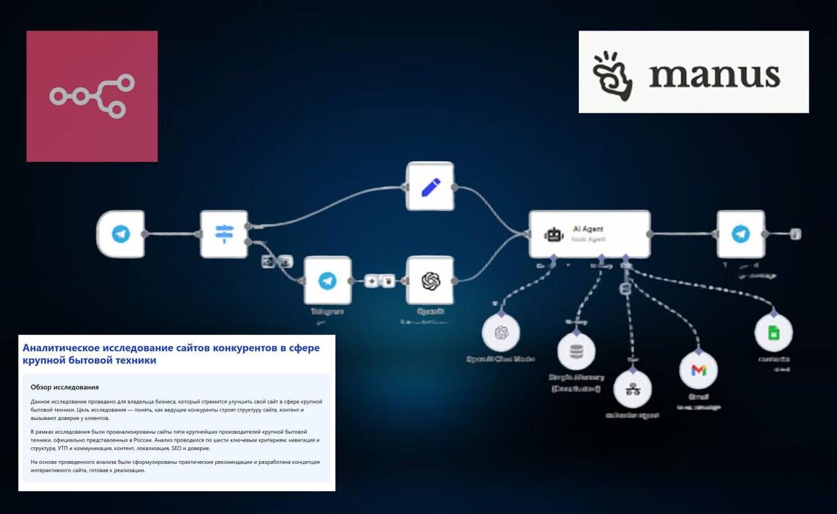 #любимым #материалы #Ютуб Ребята, привет, 👧😙 ⭐️ Хочу поделиться, на этой неделе выступала на Reforum, рассказывала про ИИ помощников, чем ИИ Агенты отличаются от ИИ Ассистентов. ✅ Показала пример работы ИИ Агента на базе Мануса и собрала простого агента на n8n. Задачи больше для демо и понимания: 1️⃣ Манус анализировал конкурентов среди производителей крупной бытовой техники. 2️⃣ А в n8n - агент, который работает в Телеграм, может отвечать на вопросы, распознавать устную речь и текст, управлять гугль-календарем и брать данные из таблички гугль-шитс и отправлять прямо из Телеграма сообщения на почту. ❤️ Хочу сказать отдельное спасибо организаторам, ребята, вы - топ! Обнимаю крепко!👧😙 📺 А после решила, а почему бы не снять для своих любимок ВИДЕО для Ютуба. ✅Взяла актуальную всем задачу по анализу конкурентов и прогнала через 5 нейросетей - по большей части новых. Результаты реально удивили. ✅Использовать можно под любое направление, главное протестируйте сами, чтобы понять,