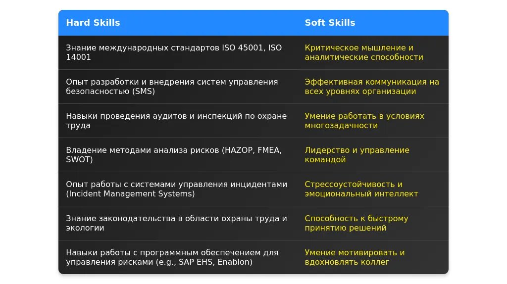 Ключевые навыки, связанные с охраной труда и безопасностью (HSE).