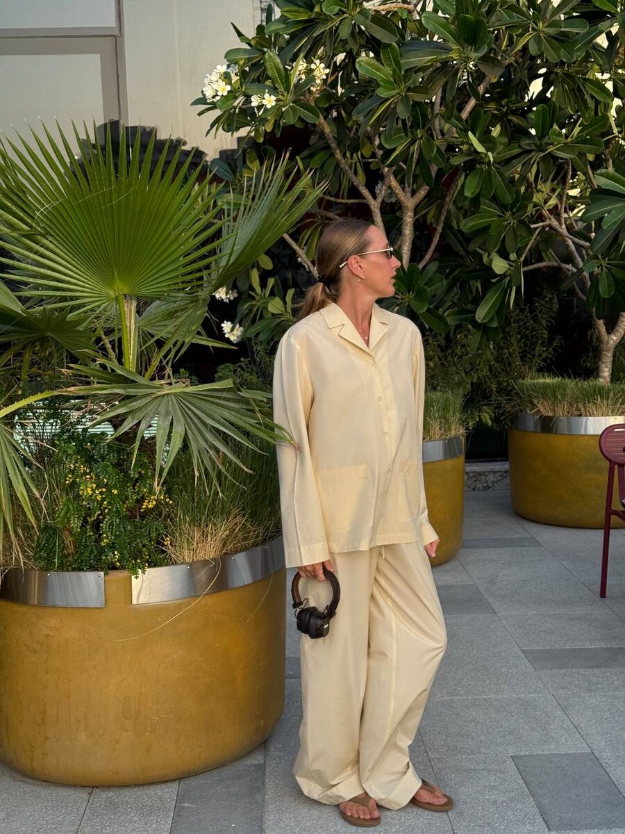 Униформа выходного дня — рубашка и брюки в летнем сливочном оттенке Дышащий тонкий материал слегка мерцает на солнце и естественно мнется, подчеркивая легкость образа. Сочетаем костюм с вьетнамками из кожи — чтобы ощущать комфорт и легкость в каждом движении Больше идей для вдохновения смотрите на нашем международном сайте. Напоминаем, что мы всегда ждем вас в гости в Кувейте — в 360 Mall, в Дубае — в Dubai и Marina Mall, в Казахстане — в Астане (ТЦ «Хан-Шатыр») и в Алматы (ТЦ Dostyk Plaza, ТЦ MЕГА), а также в Узбекистане в Tashkent City Mall