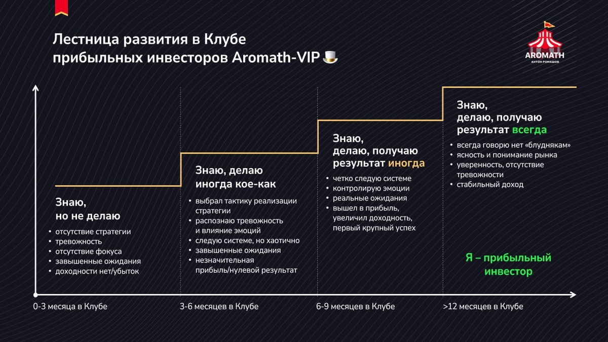 Как перестать терять деньги и начать уверенно зарабатывать на рынке? “Инвестиции – это просто!” Нам всем пытаются внушить эту мысль. Но правда в том, что это не так. Инвестиции – это всегда про: • Риск • Знания • Время • И, конечно, опыт. В Клубе прибыльных инвесторов AROMATH-VIP🎩 мы не обещаем чудес. Мы показываем, как пройти путь к стабильной прибыли быстрее, с меньшими потерями и стрессом. Успехи и стабильные результаты 30-50% годовых участников Клуба🎩 доказывают, что это возможно – нужно только желание и немного усилий. Ваш результат – это наша цель. Сейчас у вас есть уникальный шанс стать участников Клуба🎩 на 1 месяц всего за 5000 рублей и посмотреть, как работает Клуб, в котором действительно зарабатывают. А также получить доступ к курсу "Дивидендное инвестирование Aromath" и узнать, как регулярно зарабатывать на дивидендных акциях.