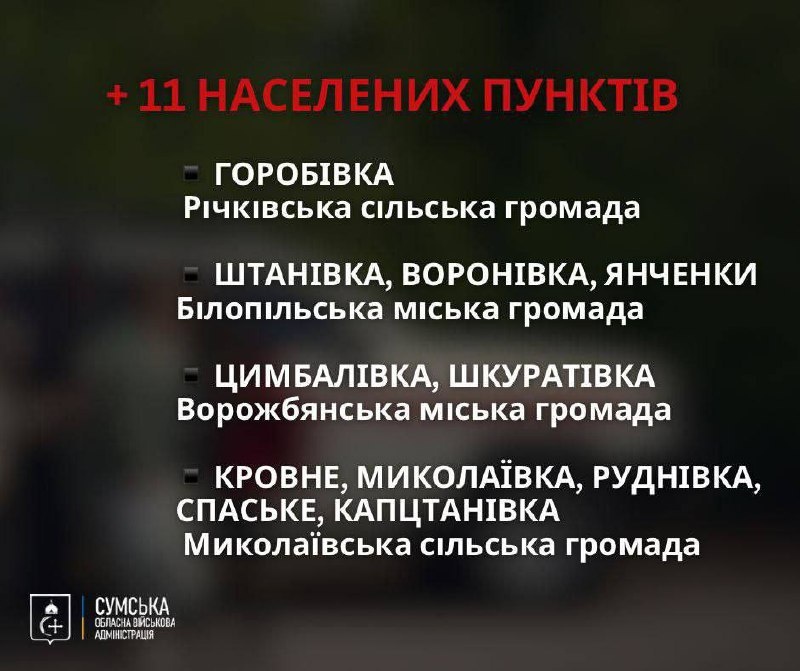Обязательную эвакуацию населения объявили еще в 11 населенных пунктах Сумской области, — областная администрация