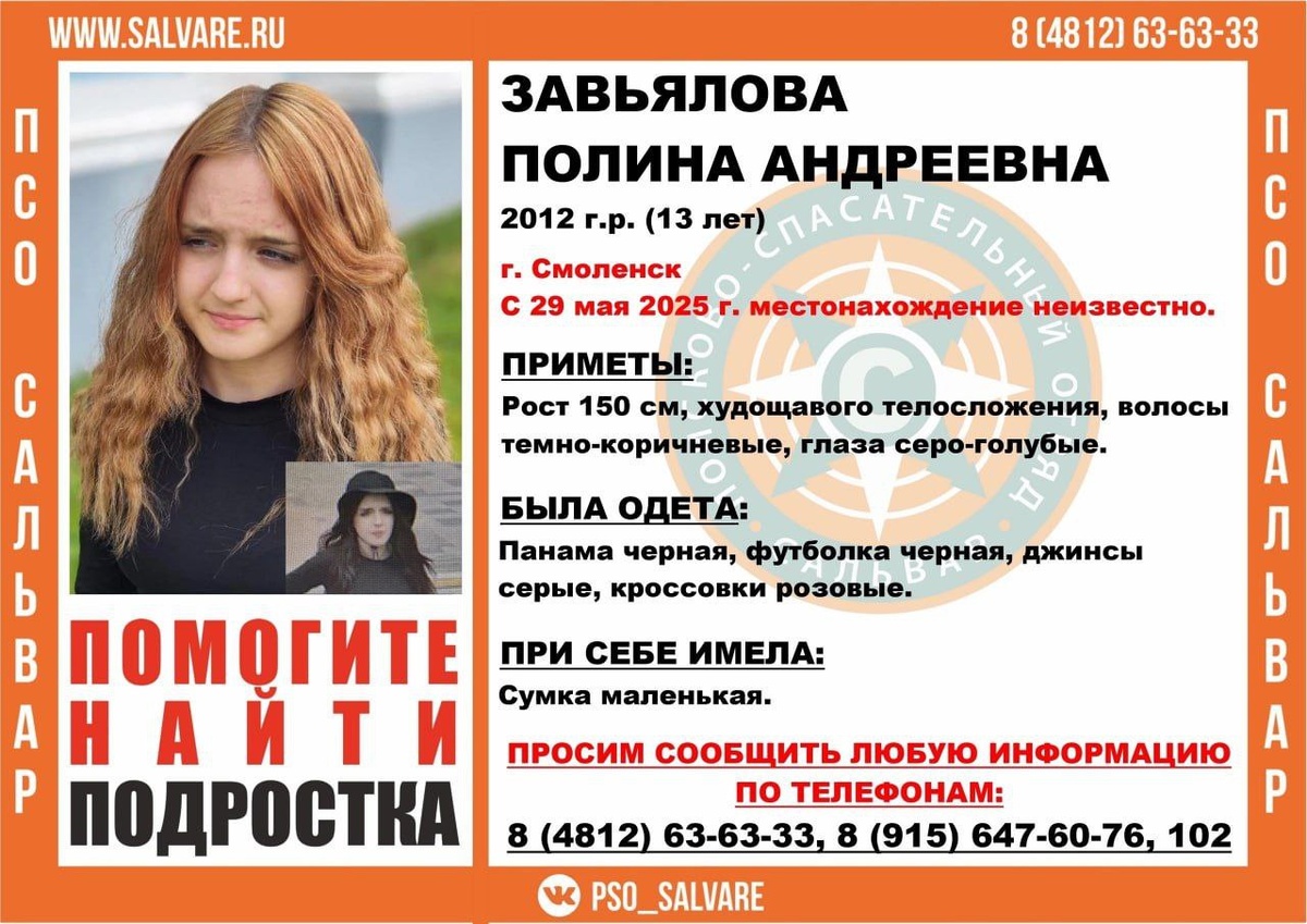 ‼️ В Смоленске пропала 13-летняя девочка 📌Завьялова Полина Андреевна (2012 г.р.) пропала 29 мая, в Смоленске. До сих пор ее местонахождение неизвестно. 👤Приметы Полины: рост 150 см, худощавого телосложения, темно-коричневые волосы, серо-голубые глаза. Была одета: в черную панаму, черную футболку, серые джинсы и розовые кроссовки. При себе имела маленькую сумку. ☎️Любую полезную информацию просят сообщать по телефонам: 8 (4812) 63-63-33, 8 (915) 647-60-76, 102. 📷: Мой Смоленск