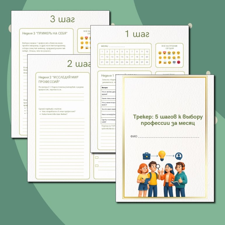 ✔️Коллеги, хочу поделиться с вами своей новой разработкой — трекер «5 шагов к выбору профессии за месяц». Это практический инструмент по профориентации для подростков 14–18 лет.