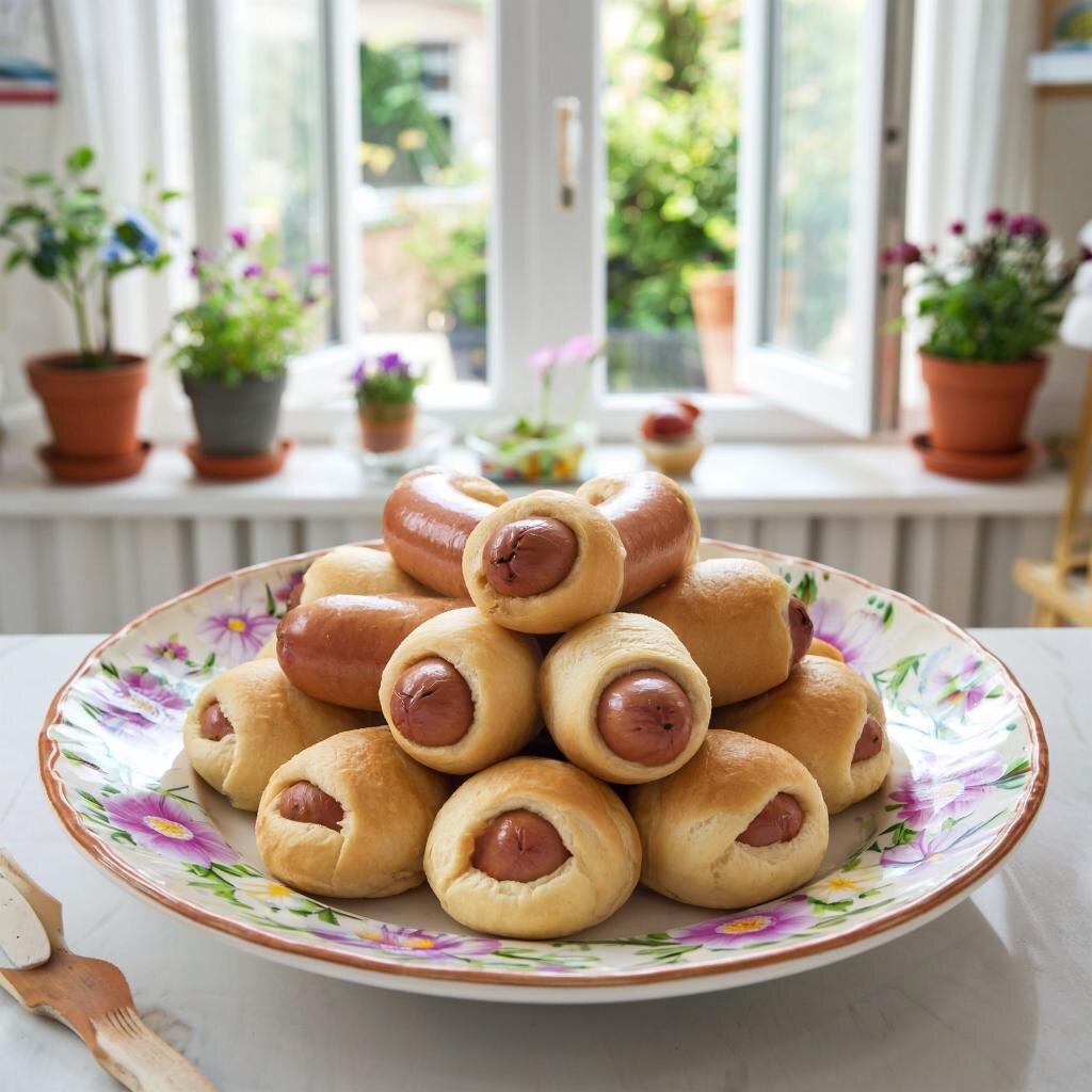 Сосиски в тесте (Хот-доги в булочке из дрожжевого теста) Это блюдо станет отличным вариантом быстрого перекуса или угощением для всей семьи. Простое сочетание сосисок и воздушного теста подарит удовольствие каждому! --- Ингредиенты: Для теста: - Сухие дрожжи быстродействующие — 1 пакетик (~7 г) - Сахар — 1 ст.л. - Молоко тёплое — 200 мл - Яйцо куриное — 1 шт. - Мука пшеничная — ~300 г - Сливочное масло — 50 г - Щепотка соли Для украшения: - Желток одного яйца (разведённый молоком) - Семечки кунжута или льна (по желанию) --- Как приготовить? 1. Активируем дрожжи: - Растворите сухие дрожжи в небольшом количестве тёплого молока, добавьте чайную ложку сахара и одну столовую ложку муки. Оставьте в теплом месте на 10–15 минут, пока масса не поднимется шапочкой. 2. Замешиваем тесто: - В миску просейте оставшуюся муку, добавьте остальные ингредиенты: остаток теплого молока, яйцо, растопленное сливочное масло, соль и активированные дрожжи. - Замесите эластичное тесто руками или с