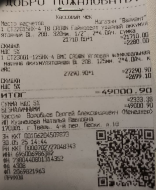 Докладываю. С грустью вынужден констатировать печальную тенденцию. Вчера специально мониторил работу волонтерских групп как в стране, так и в Тверской области. Увы, должен сделать вывод, что сборы повсеместно падают. Причем, касается это не только России, но и соседнего государства. Но мы - не такие! Вчера и сегодня утром (спасибо Юрию Сергеевичу за утро) вновь крепко отработали. Сумма сбора по состоянию на 08:20 час. по Москве 31.05.2025 составляет 3 682 071,53 руб. Вчера купил аккумуляторные гайковерт и угловую шлифмашинку. Инструмент хорошего качества, в полном сборе, с запасными аккумуляторами. Цена 49 000 руб. Также закуплены квадроцикл за 770 000 руб. и два мотоцикла по 170 000 руб. каждый. Ниже чек и часть договора купли-продажи. Товарищи, под видео прозвучал вопрос: почему наш постоянный поставщик дал маленькие скидки? Да, в этот раз общая скидка составила всего 30 000 руб. Но если сложить все скидки, что он дал нам за время совместной работы, то получатся сотни тысяч рублей