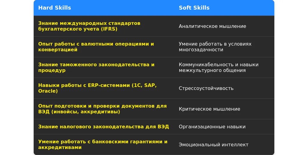 После адаптации: "Знание валютного законодательства, опыт работы с таможенными декларациями, умение работать с ERP-системами (1С:Бухгалтерия)."
