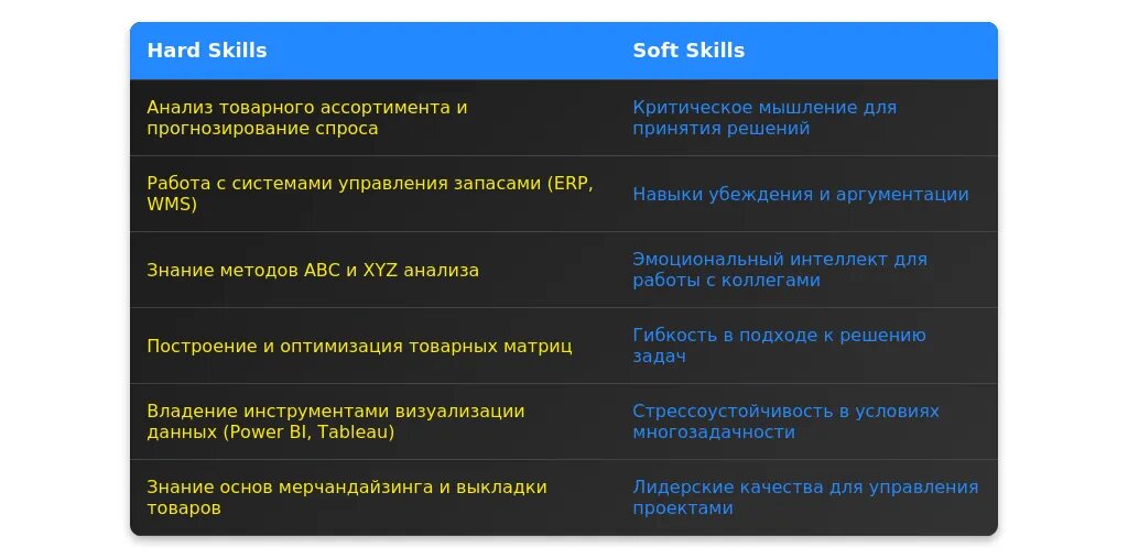 Ключевые навыки (анализ, управление запасами, взаимодействие с поставщиками).