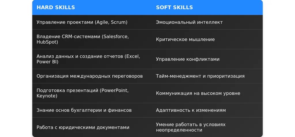 После: "Навыки взаимодействия с топ-менеджментом и внешними партнерами, включая переговоры."
