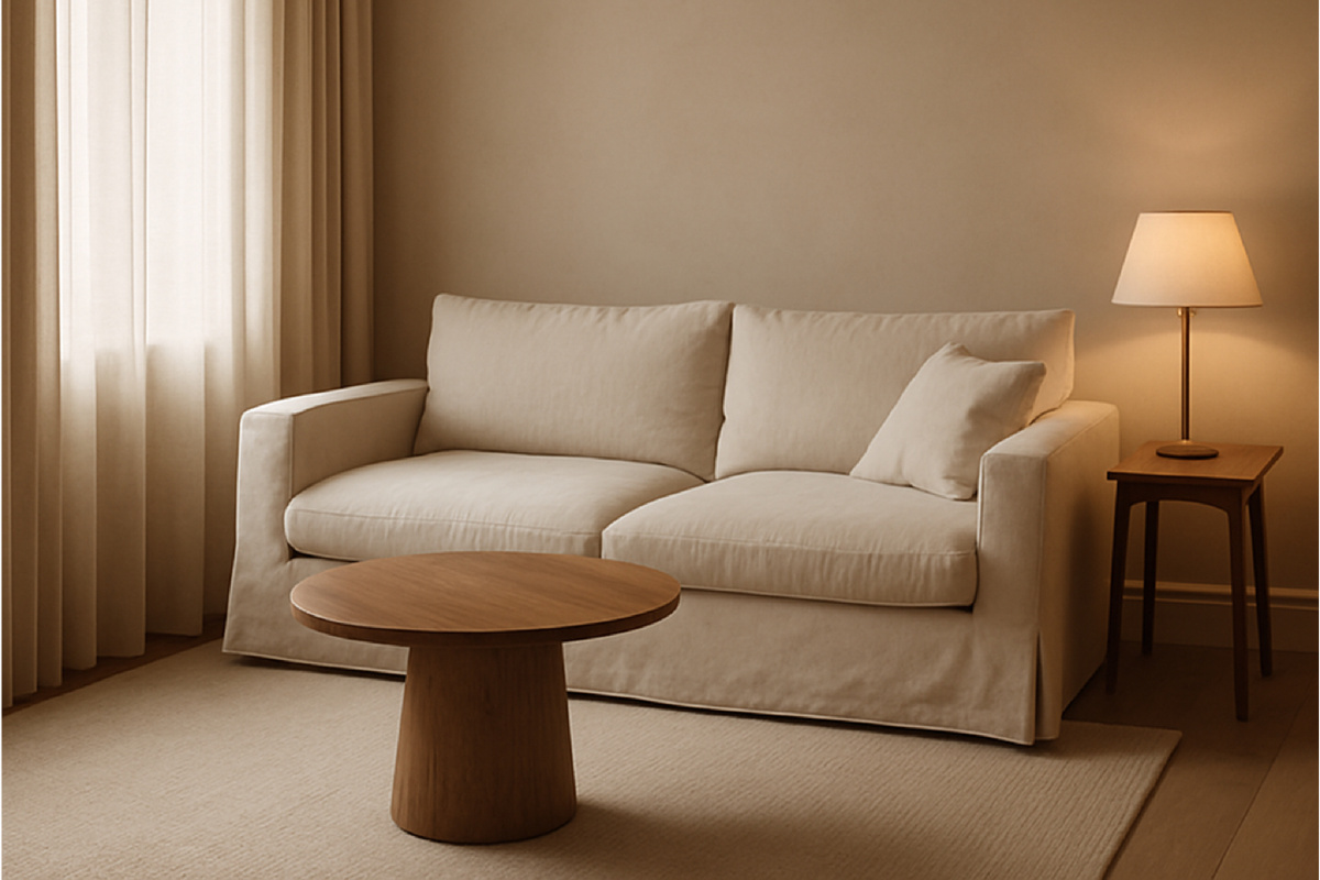 Мы собирали палитру как ткань: тон в тон. Сложный белый, дымчатый серо-тёплый, дерево с янтарным подтоном, немного графита — не как акцент, а как пауза.