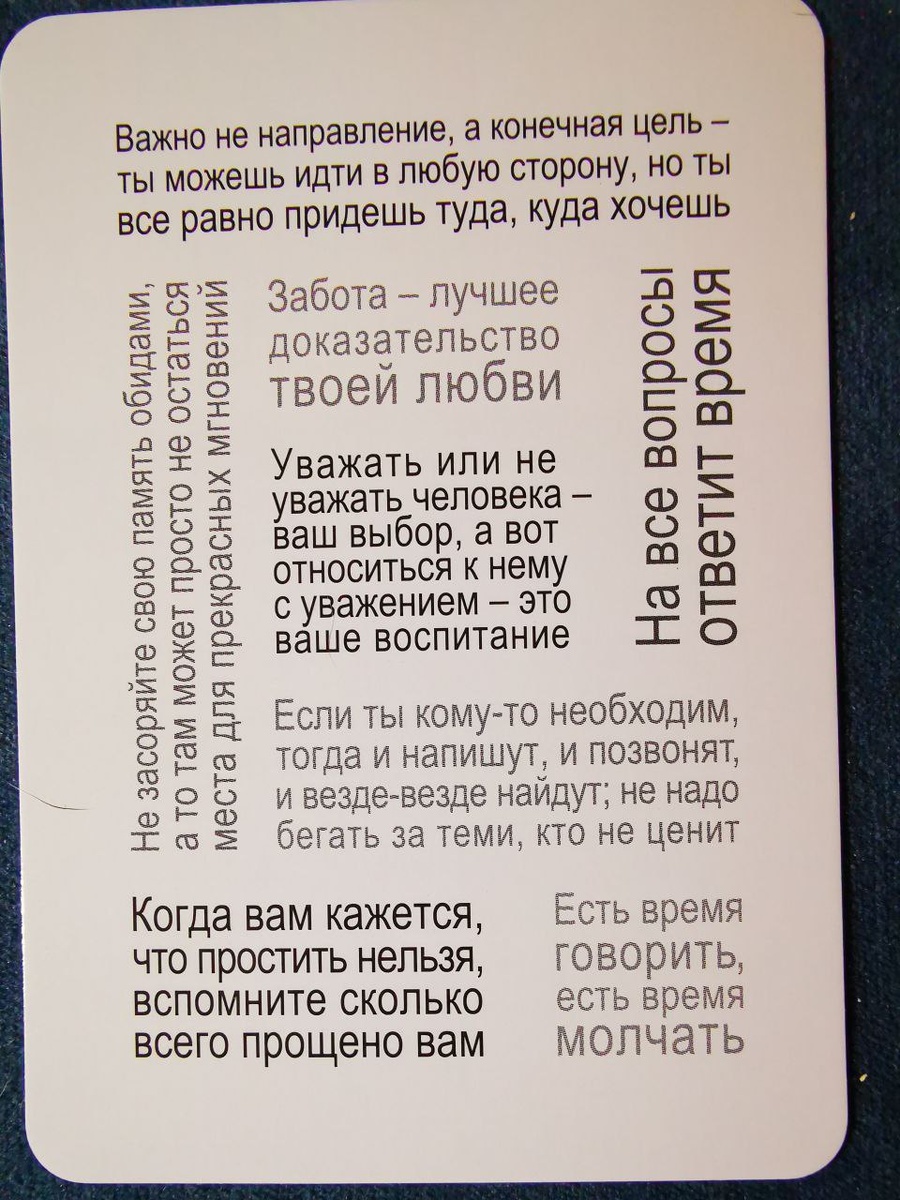 Сосредоточьтесь, перед вами карта. Она подсказка (или совет) на все случаи жизни. Вы формируете некий запрос и открываете карту. Важной будет та фраза, КОТОРАЯ ПЕРВОЙ бросилась в глаза.