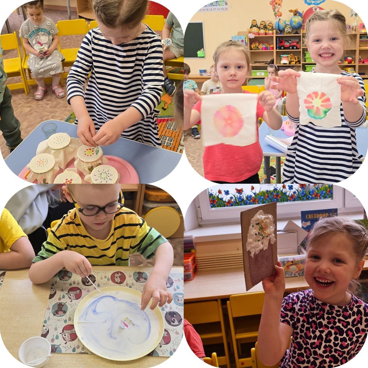 В продолжение темы нетрадиционных техник рисования воспитатели группы 40 детского сада "Рябинушка" решили провести для своих детей "Цветные эксперименты". Ребята с нетерпением ждали их каждую неделю. Они получали новые цвета при смешивании красок. Красили цветы, пекинскую капусту, благодаря чему узнали, что вода поднимается по стеблям и красит лепестки в разные цвета. Разделили цвета на составляющие, создавали объёмные краски при помощи крема для бритья, клея ПВА и пищевых красителей. Создавали цветные, танцующие капли с помощью клея БФ, воды и красок. Делали радугу из конфет, рисовали на молоке, создавали разноцветные слои при помощи обыкновенного сахара и красок, создавали дождевые облака. Узнали, кто обитает на дне океана и многое другое.