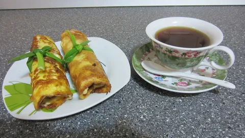 - Начиная со стороны с огурцами и сыром, свернуть блинчики в плотный рулетик.