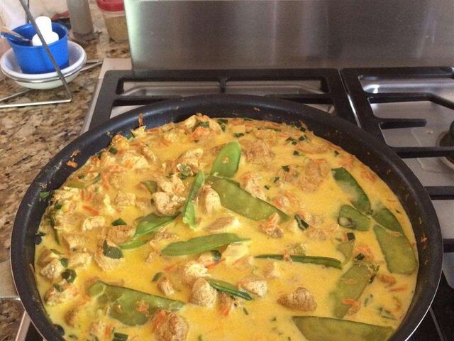 Тайская кокосовая курица Это блюдо очень простое и содержит меньше жира! ⌛ Подготовка: 10 мин. ⏰ Приготовление: 30 мин. 🍴 Количество: 4 порции Ингредиенты ✅ 2 чашки сухого жасминового риса ✅ 3 чашки воды ✅ ¼ кг половинок куриной грудки без кожи и костей - кубиками ✅ 1 столовая ложка порошка карри ✅ 2 чашки 2.50 см кусочков спаржи ✅ 1 чашка снежного горошка ✅ ½ чашки измельченной моркови ✅ 1 чашка измельченного зеленого лука ✅ 1 (400 гр) банка светлого кокосового молока. Инструкция приготовления 1. В кастрюле емкостью 2 литра соедините воду и рис. Накройте крышкой и доведите до кипения на сильном огне. Уменьшите огонь и варите в течение 20 минут. 2. В миске среднего размера соедините курицу и порошок карри, перемешайте, чтобы обмазать. 3. Покрыть большую антипригарную сковороду кулинарным спреем. Готовьте курицу, часто помешивая, на средне-высоком огне в течение 4 минут. Добавьте спаржу, снежный горошек, морковь и зеленый лук; готовьте 3 минуты. Влейте кокосовое молоко и продол