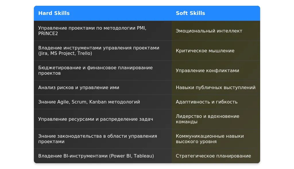 Акцент: Навыки организации, аналитическое мышление, коммуникабельность, знание методологий управления проектами (например, Agile, Scrum).