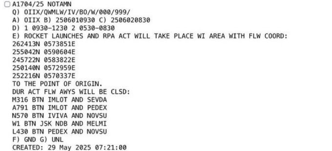 В ответ на пост IDF to strike Iran on Shavuot religious holiday that starts Sunday — Israel parliament source Iran orders this NOTAM no-fly zone for next 2 days