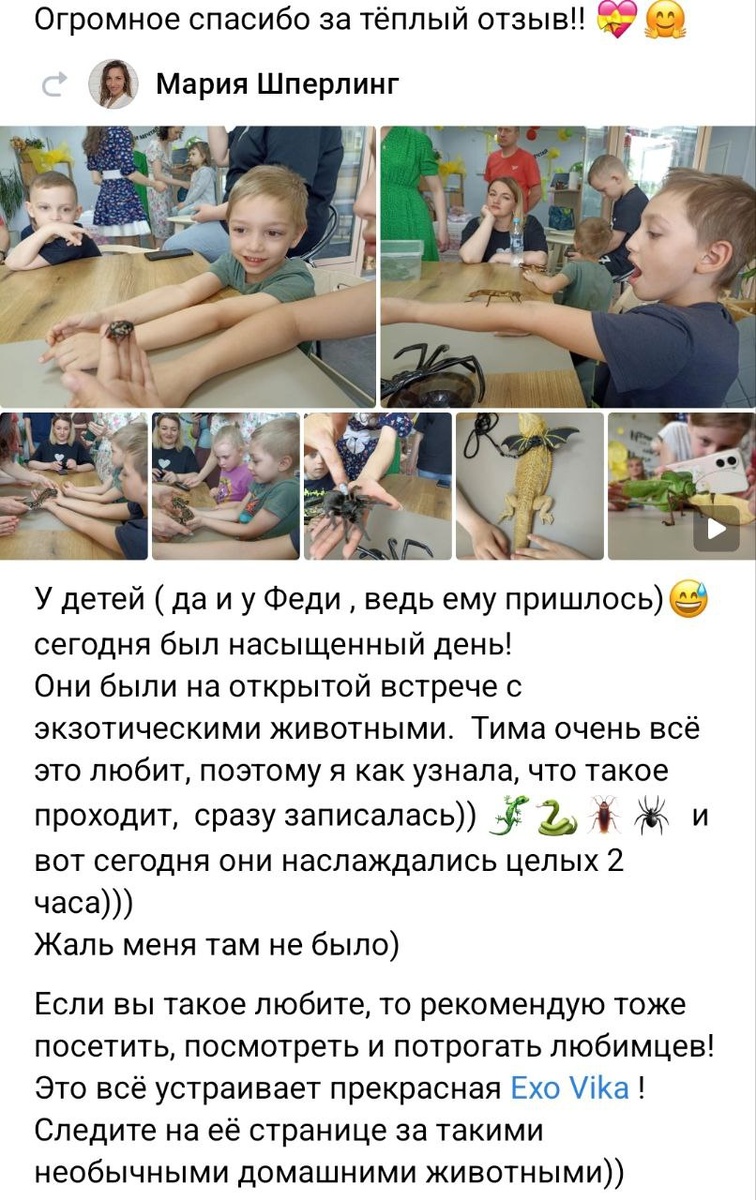 Ваши отзывы - это всегда так приятно!! Душа поёт!!)) И неважно, пишутся они в день встречи, на следующий день, или когда после нее прошло больше месяца!!) Это ещё интереснее) Значит, наши питомцы оставили глубокие впечатления! 🦎🐍🦗🦂🕷️🕸️🪳🪱🤗☺️👍 И отдельное спасибо приглашающим нас замечательным местам нашего города: Кафе Жуйконтент, кафе ЗефирОль - здесь вас примут со своими тараканами 😆