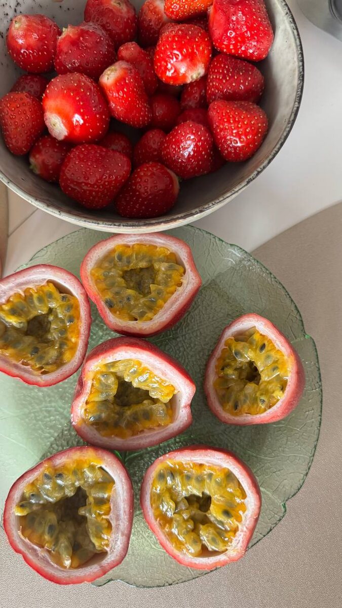 Краски лета! С недавнего времени полюбила маракуйю. Раньше очень к ней была равнодушной и совсем не ела! А теперь где вижу всегда покупаю. И она бывает разная: зеленая, розовая и темно фиолетовая! Маракуйя: польза в двух словах 🌿 ✔Иммунитет – много витамина С. ✔ Пищеварение– клетчатка для кишечника. ✔ Сердце – калий + антиоксиданты. ✔ Кожа – витамин А + омоложение. ✔ Сахара в крови – низкий ГИ, можно при диабете. Для меня это супер фуд! Вкусно и полезно! 💜