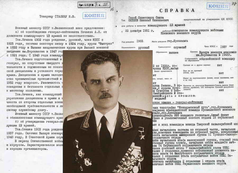 «Министерство Вооружённых Сил Союза ССР вносит предложение о назначении генерал-лейтенанта ОЛЕШЕВА Николая Николаевича – КОМАНДУЮЩИМ 14 АРМИЕЙ.Армейское Управление формируется на базе 126 лёгкого горно-стрелкового корпуса.Командир этого корпуса генерал-лейтенант ФЕДЮНЬКИН И.Ф. по состоянию здоровья подлежит освобождению от должности и переводу в Европейскую часть Союза ССР, для лечения» (РГАНИ, ф. 3, оп. 50, д. 132, л. 65).