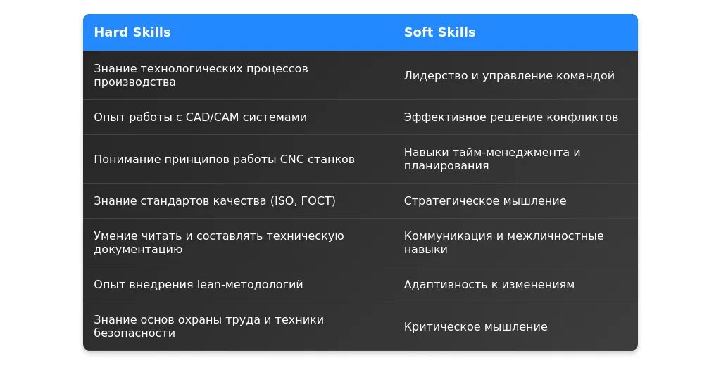 До: "Навыки управления, коммуникация, знание производственных процессов."