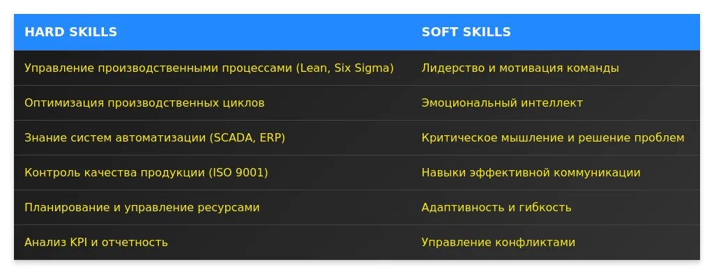После адаптации: "Знание ERP-систем, управление коллективом до 50 человек, внедрение Lean Manufacturing, контроль качества по стандартам ISO."