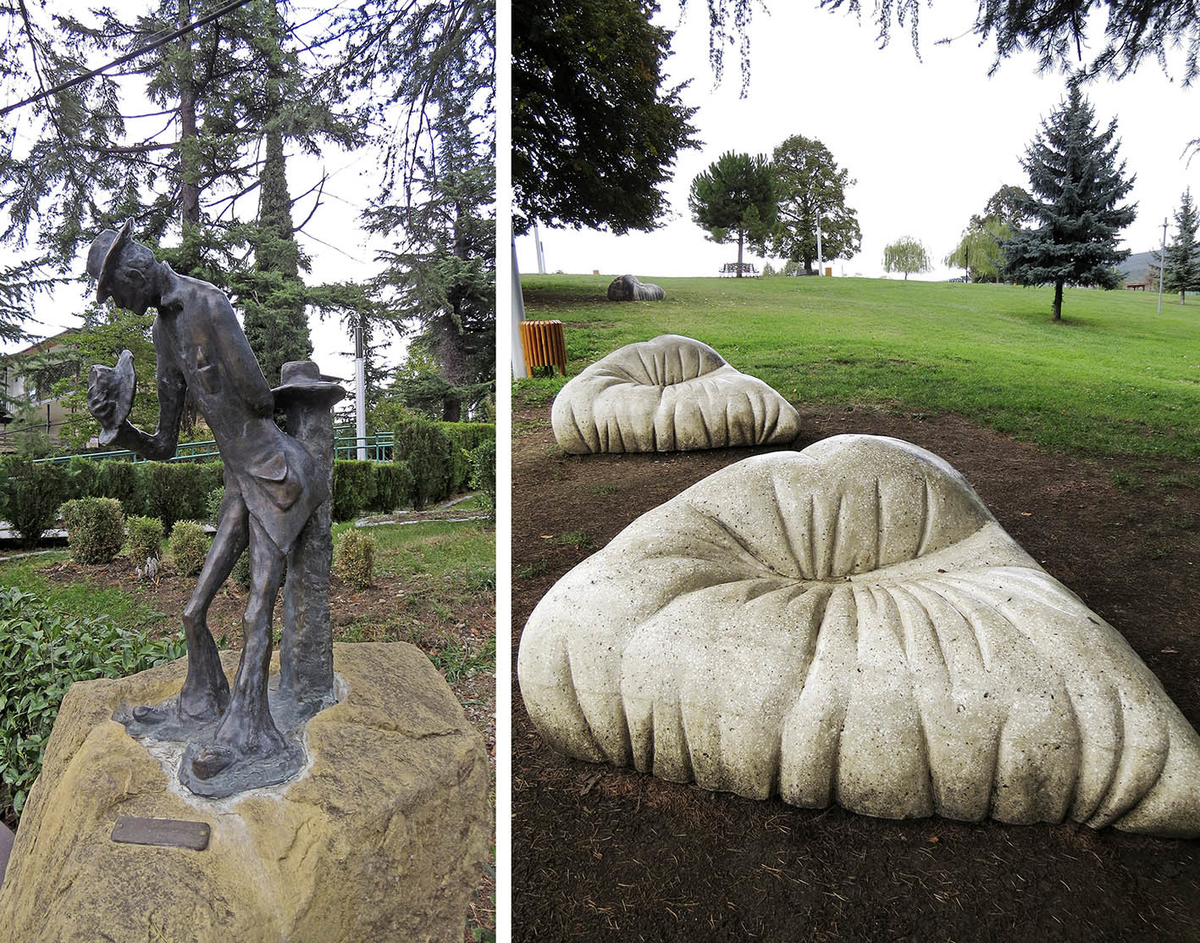 Из центра Телави улица ведёт в прогрессивнейшего вида парк Надиквари: Благоустроенный в 2017 году вокруг памятника Леси Укpaинке, подаренного Kиeвом в мирном и многовекторном 2010 году. Даже и не совсем по разнарядке: медленно умирая от туберкулёза костей, под конец жизни поэтесса тянулась к теплу, и её муж Климент Квитка, малозаметный судейский чиновник и увлечённый фольклорист, добился перевода в Грузию. По которой супруги и кочевали от суда к суду, редко задерживаясь где-то дольше нескольких месяцев. В Телави они жили в 1909 году, но ничего знаменитого именно здесь Лариса Косач (таково её настоящее имя) не написала. Помимо памятника, в парке примечательны очень стильный ресторан... ...и, конечно же, виды дальней дали. Если с крепости они открываются на север поперёк Алазанской долины, то отсюда - на юго-восток, в сторону её далёкого устья. На краю города видны кладбище с современным Воскресенским храмом: И церковка Святой Нины 18 века на одиноком холме: