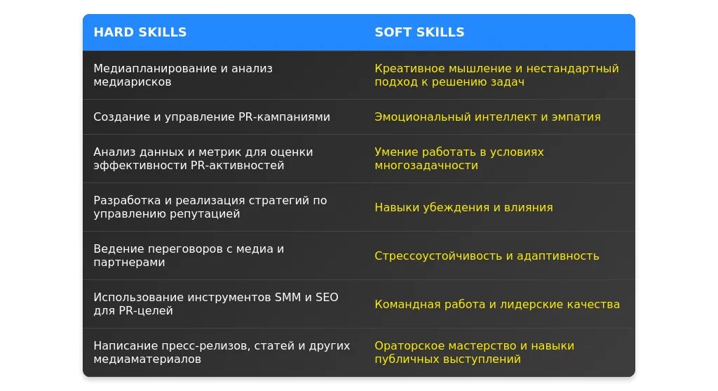 Навыки необходимо перегруппировать и выделить те, которые наиболее актуальны для вакансии. Например, для PR-менеджера важны навыки работы с медиа, написания пресс-релизов и управления проектами. Используйте ключевые слова, такие как "медиа-планирование" или "кризисный PR".