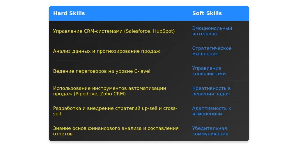После адаптации: "Навыки ведения переговоров, работа с возражениями, знание CRM-систем."