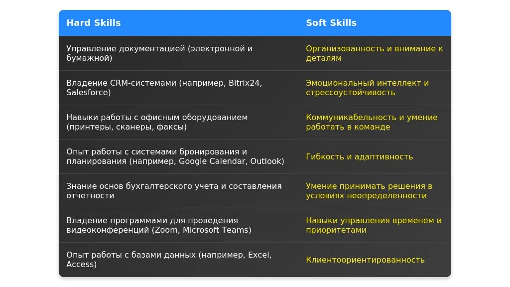 Пример 2: "Организация встреч и управление расписанием руководителя". Это указывает на необходимость навыков тайм-менеджмента и работы с календарями.