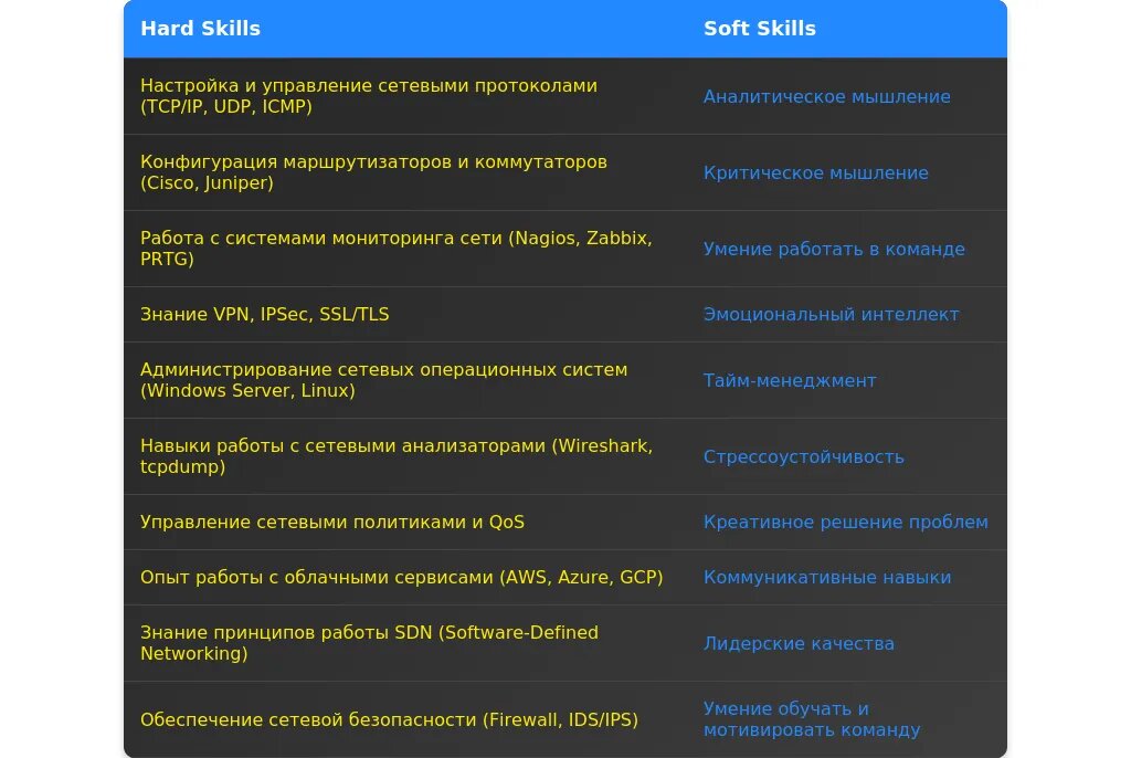 - Ключевые навыки и компетенции (например, работа с сетевыми протоколами, администрирование).