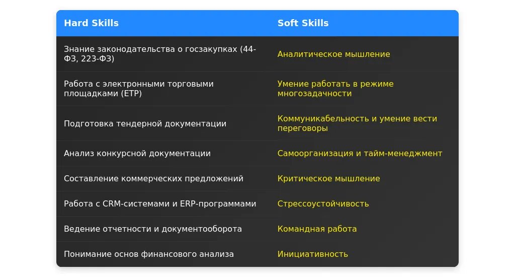 На что делать акцент: базовые навыки (работа с документацией, поиск тендеров), личные качества, мотивацию.
