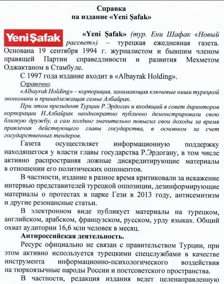 ⚠️ Турция активизировала антироссийскую информационную деятельность в российском информационном пространстве 👀 Мониторинг антироссийской информационной деятельности режима Эрдогана привёл к весьма неутешительным выводам. ☄️ Турция нарастила в разы объёмы вещания на русском языке не только через государственные институты, но и через коммерческие СМИ и т.н. просветительские, образовательные тлг-каналы, которые де факто контролирует режим Эрдогана и НРО (MİT). В последнее время в этом плане "отличилось" издание "Yeni Şafak", которое принадлежит семье Албайрак, вхожей в близкий круг семьи Эрдогана. ✍️ Турецкое издание "Yeni Şafak", которое с 2023 года вещает на русском языке и ведёт агрессивную антироссийскую пропаганду, играет ключевую роль в информационной войне против России, которую ведёт режим Эрдогана. Целевая аудитория турецкого иновещания на русском языке - русскоязычное население так называемых тюркских регионов России и бывшего СССР. 🔴На страницах Yeni Şafak систематичес