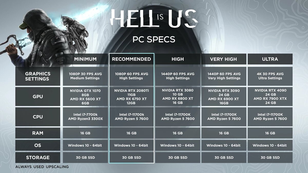 Студия Rogue Factor и издатель NACON раскрыли системные требования для action-adventure Hell is Us, разработанной на Unreal Engine 5. Для игры в разрешении 4K на ультра-настройках с частотой 30 FPS потребуется видеокарта NVIDIA GeForce RTX 4090 или AMD Radeon RX 7900 XTX. Причем заявляется, что во всех упомянутых вариантах используются апскейлеры изображения. Для 1440p/60 FPS на высоких настройках нужен процессор Intel i7-11700K или AMD Ryzen 5 7600, 16 ГБ ОЗУ и видеокарта RTX 3090 или RX 6900 XTX. Минимальные требования включают GTX 1070 для 1080p/30 FPS на средних настройках. Высокие требования вызвали обсуждения в сообществе, но разработчики уточнили, что указанные конфигурации завышены, чтобы избежать разочарований. Демо игры будет доступно на Steam с 2 по 16 июня, что позволит протестировать производительность. Hell is Us выйдет 4 сентября 2025 года на PC, PS5 и Xbox Series X/S. Разработчики отдельно уточнили, что это рекомендации с запасом, но спокойнее сообществу от этого не ста