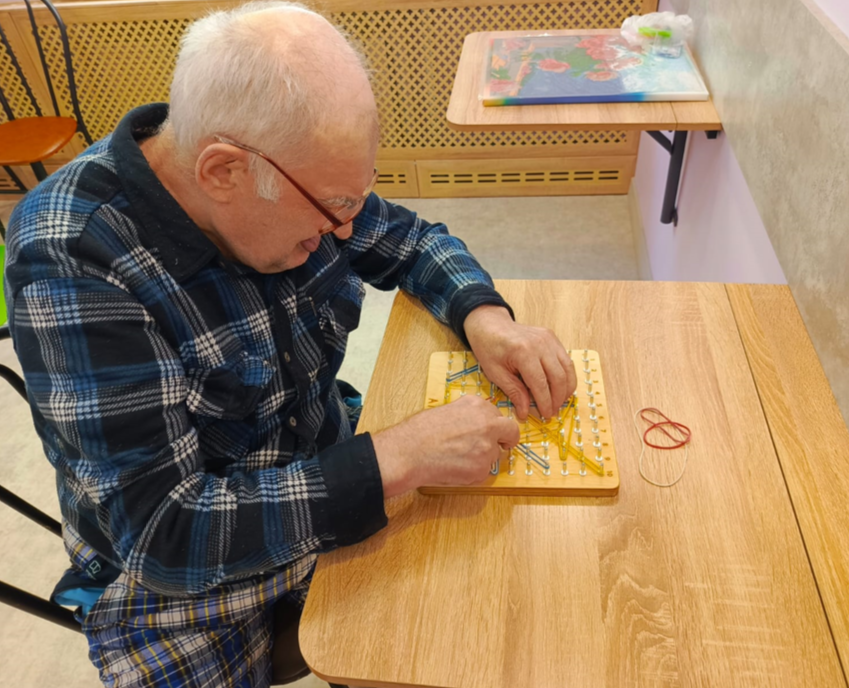 Как цель работы в проекте Сергей Петрович выбрал создание открытки для знакомой из того же интерната. Также он занимался физической культурой и когнитивными тренингами. Для поддержания мелкой моторики использовалось переданное фондом оборудование – прозрачный мольберт, геоборд и другое. Наконец, была создана и красочная открытка.